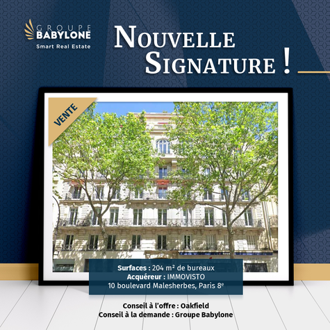 Groupe Babylone installe la société IMMOVISTO, qui vient d'acquérir une surface de 204 m² de bureaux, au 10 boulevard Malesherbes, 8e arrondissement de la Ville de Paris.